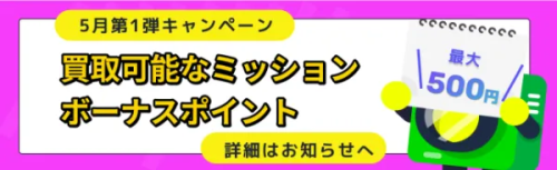 5月は「買取可能なミッション」が超お得! 第1弾 5月10日~5月20日 期間内に買取可能なミッションに参加していただいた方の中から、 抽選で50名様に500円相当のポイントプレゼント!